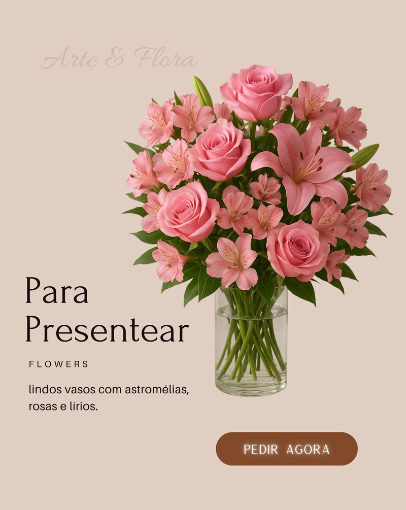 Arranjo com vaso com flores astromélias, rosas, lírios, cor rosa